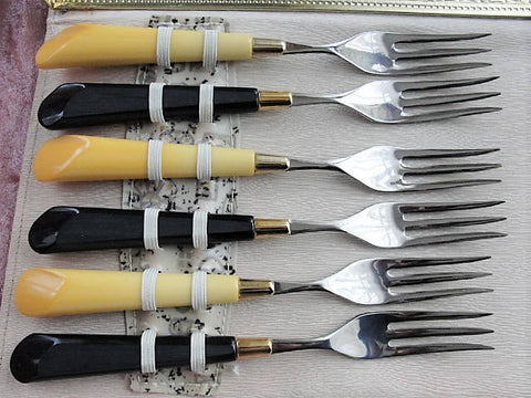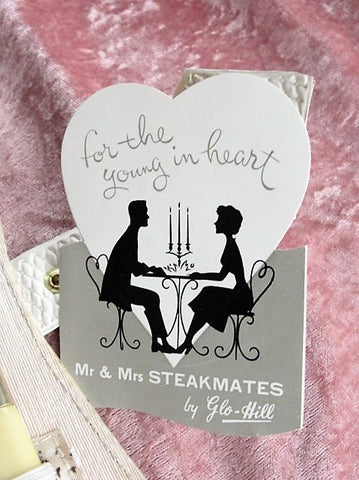 Wonderfully serrated Steakmates De-Luxe Bakelite knives by Glo-Hill Cutlery of Canada. These were part of the Mr and Mrs Steakmates line, which had the caption " for the young in heart" which is INCLUDED with the set.